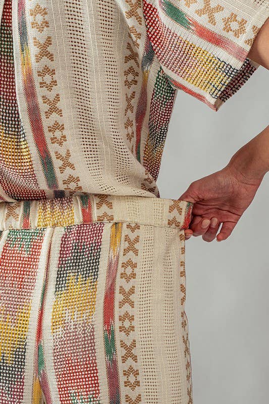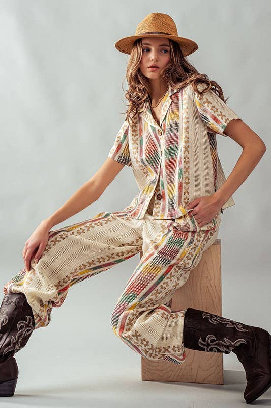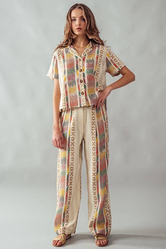 We've been hooked on 2pc sets for years, but this one hits all the right notes. It's chic, versatile, and oh-so cozy, with a fabric that's simply divine. Crafted from a poly/viscose blend, our model, who stands at 5'8" and wears a size small, rocks this set effortlessly. The unlined button down shirt has side slits, and the elasticized waistband pants have a functional button and zipper as well as a cotton lining. Wear them together, or mix and match for endless outfit possibilities when you're on the go!