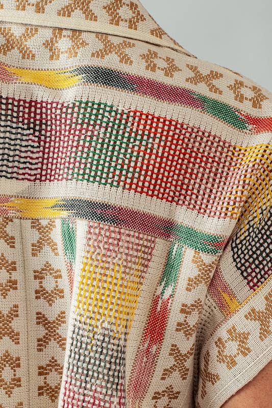 Calling all Jetsetters!!!! Our versatile Midi Embroidered Cross-Stitch Shirt Dress is a must have for your Spring/Summer Travels. With convenient pockets, side slits, a removable belt, and the ability to be worn open over a swimsuit or over jeans, this dress is perfect for the adventurous soul. Fabric has Peruvian Textile vibes and is made of a poly/viscose blend with a partial cotton lining. Model is 5'8" and wearing a size small.