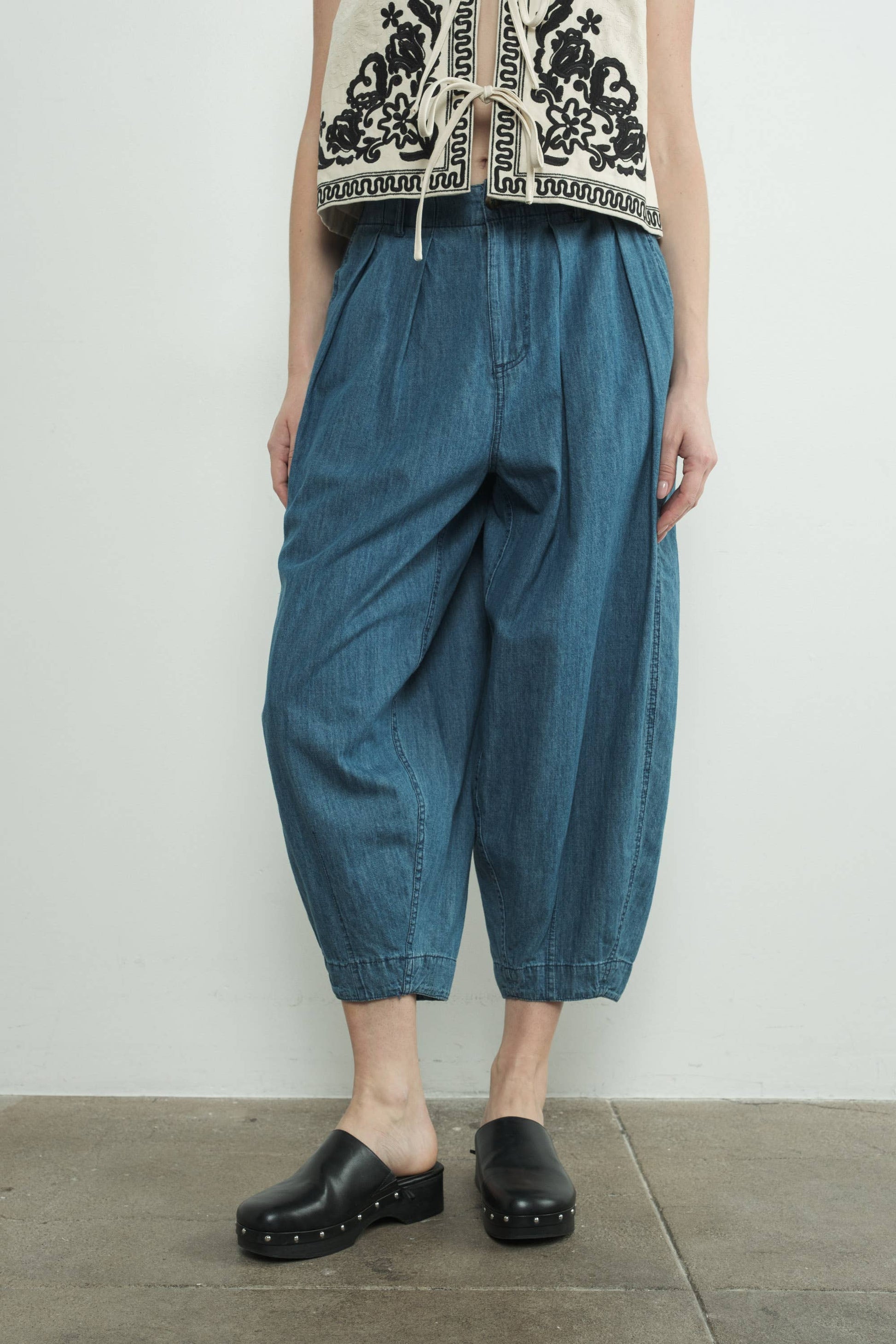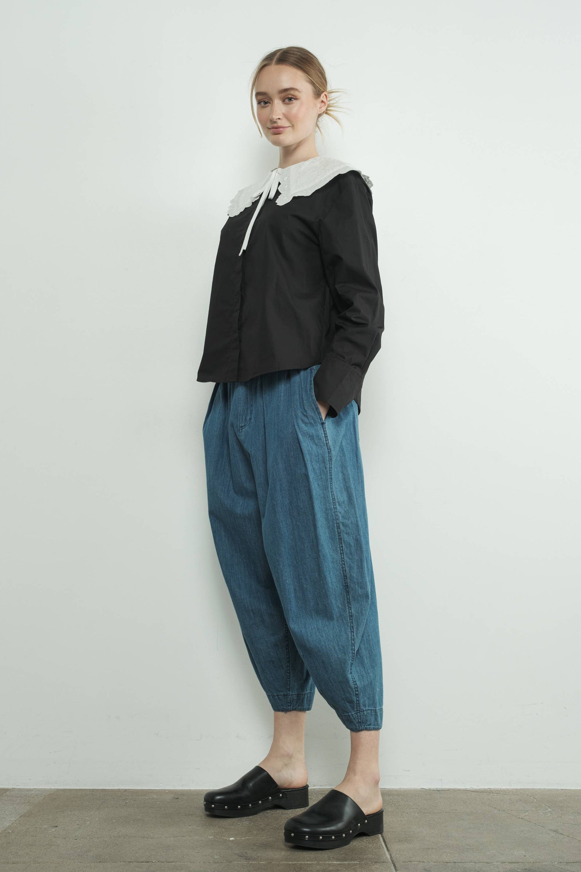 Experience effortless style and maximum comfort with our Larz Barrel/Harem Pants. Crafted from lightweight denim, these pants feature a pleated front detail for added flair. The elastic back waist ensures a relaxed fit that will elevate any look. Made from 100% cotton for a luxurious feel.